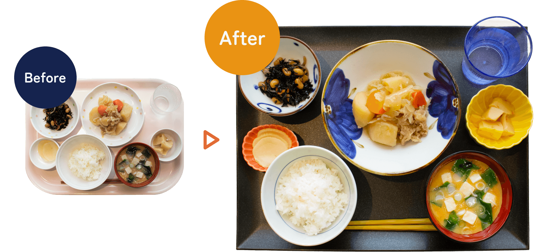 面積の大きいお皿を磁器に変えるだけで、食事全体の見た目がワンランクアップし、お食事の満足度向上や残食率の低下が叶います。