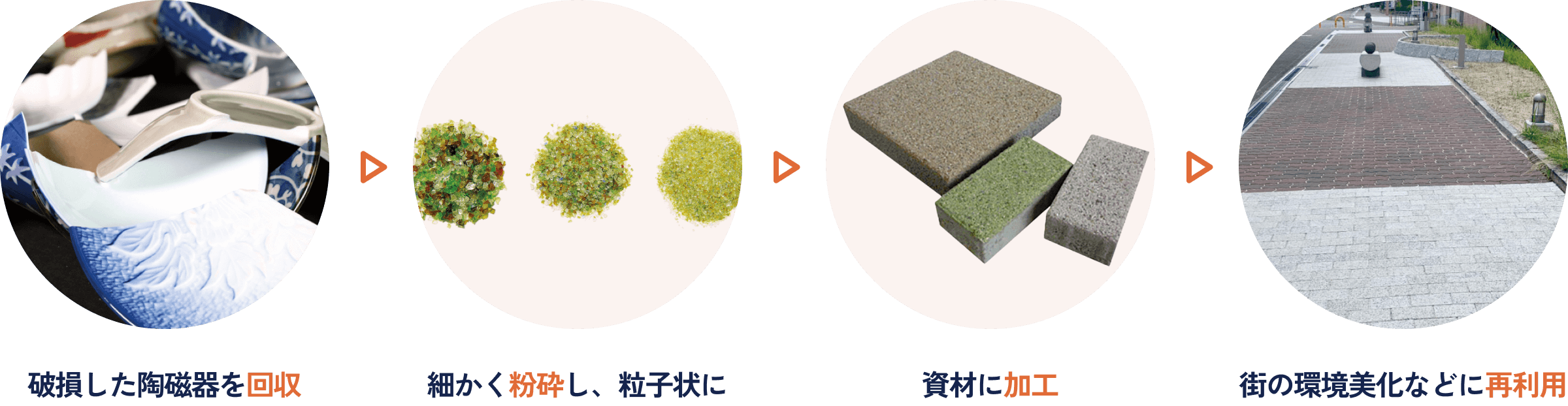 破損した陶磁器はテーブルコーデで回収し、細かく粉砕して道路などの建設資材にリサイクルを行い環境保護に役立てます。