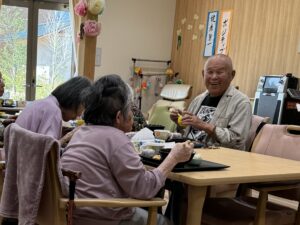 お食事が終わっても、デイルームにて過ごされ、ご利用者様同士でお話をされる方が多いです。「1日の中で食事が一番好き!ここの食事は楽しい。普通に皆と話をしながら食事ができてありがたい」と利用者の方がお話ししてくださいました。